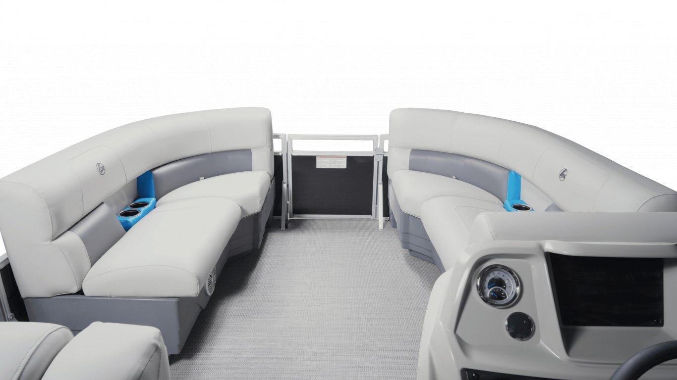 Legend Boats Fun Series 20 Rear lounge with extra long 4-person sofa.