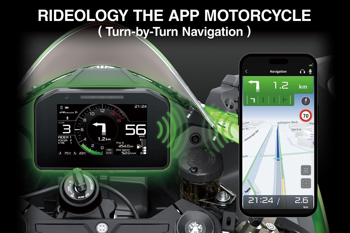 Race-style shift lamp + full-colour TFT screen with digital speedometer, analogue-style tachometer (Type 1 display), digital bar-style tachometer (Type 2 display), gear position indicator, fuel gauge, odometer, dual trip meters; current and average fuel consumption, remaining range, average speed, total time, battery voltage (Type 1 display); max lean angle indicator; intake air temperature (Type 1 display), coolant temperature; clock; Riding Mode indicator, KTRC indicator, Power Mode indicator, KEBC, KCLM, KQS, Electric Cruise Control; Kawasaki service reminder; smartphone call and mail notices, smartphone battery level; headset, voice command status and riding log status indicators; app connected indicator; Economical Riding Indicator (Type 1 display); low-battery indicator, and warning display and service messages; turn-by-turn navigation (Type 1 display); lap timer (Type 2 display)
