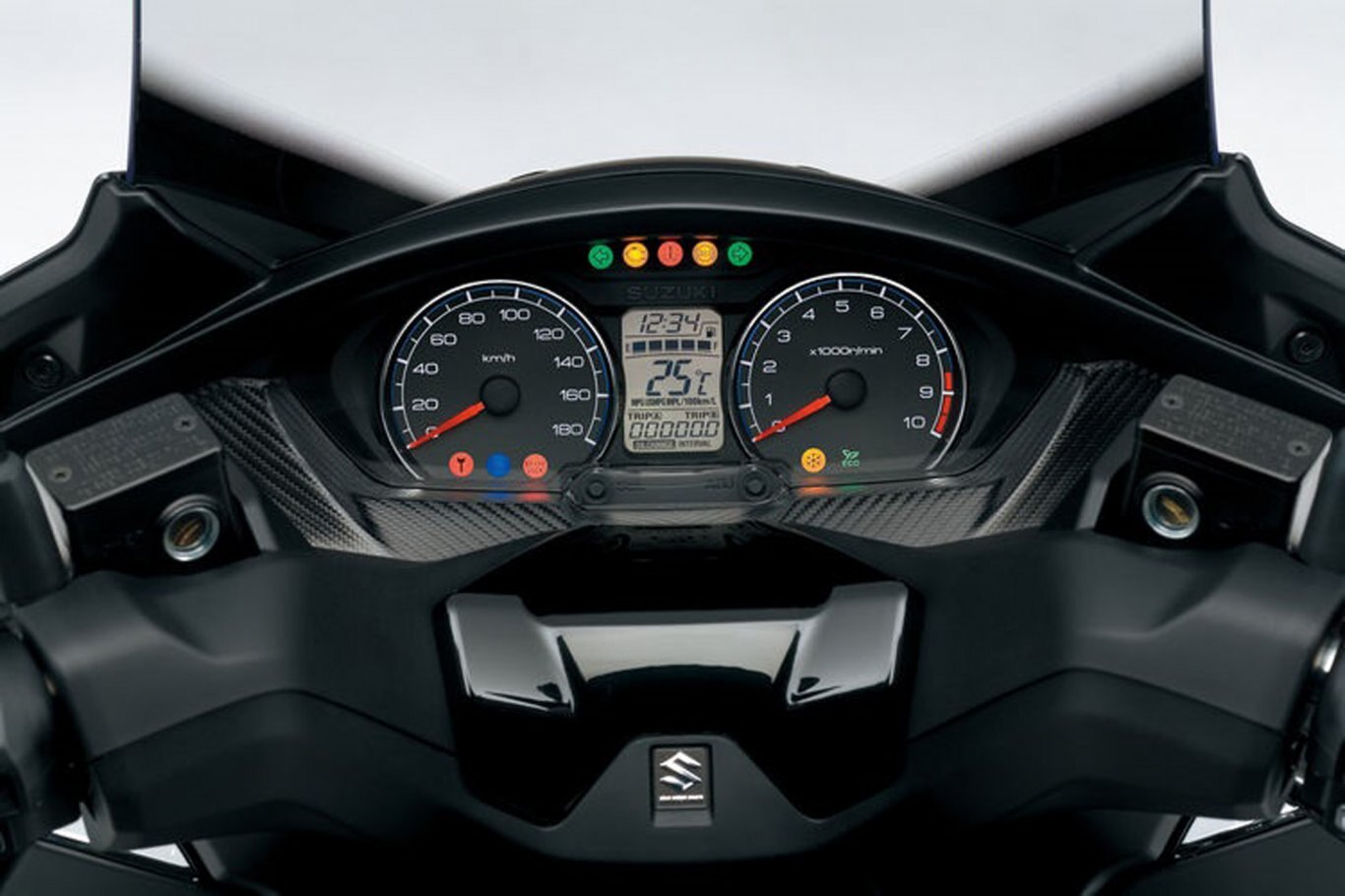 Large, easy-to-read analogue speedometer and tachometer dials flank a digital display that shows an odometer, dual trip meters, fuel gauge, coolant temperature indicator, average fuel consumption meter, ambient temperature indicator, freeze indicator*1 and clock. Also included is Suzuki’s Eco Drive Indicator, which come on when the vehicle is operated in a fuel-efficient manner and may help riders learn techniques to better economize on fuel*2.