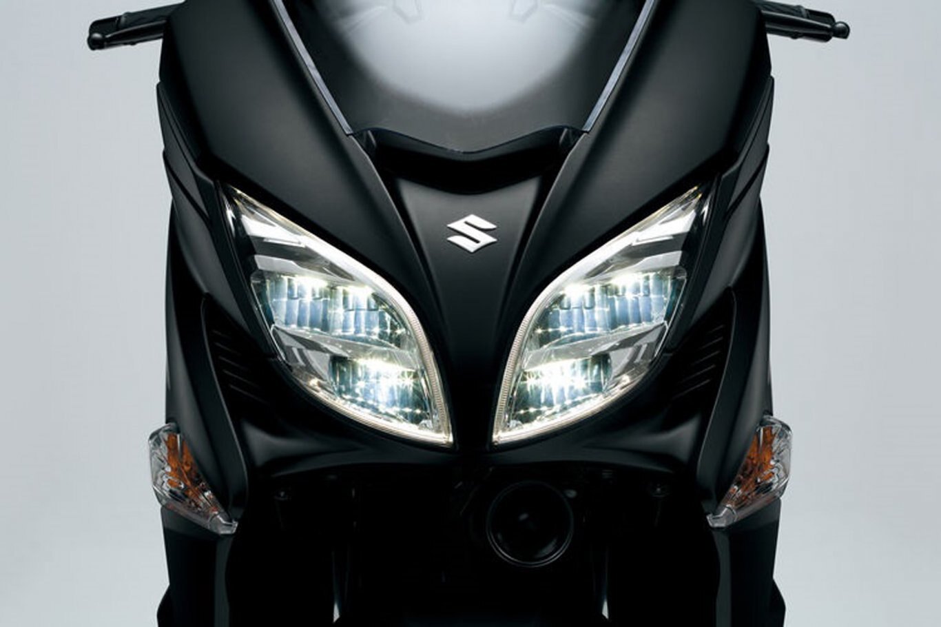 The slim, elegant styling of the nose features sharply styled dual LED headlights with integrated LED position lights and turn signals mounted beneath. The overall effect creates a cleaner and lighter looking front end that is instantly recognizable as belonging to the BURGMAN family.