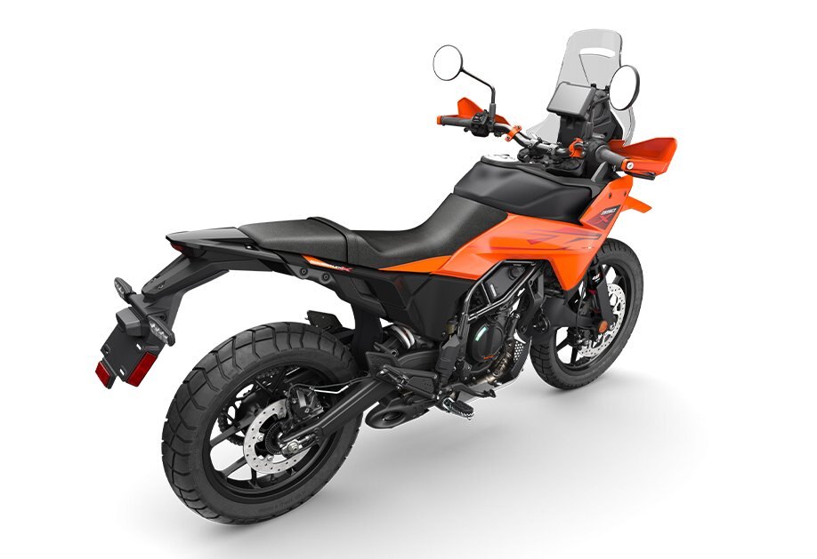 The KTM 390 ADVENTURE range features distinctive KTM-style bodywork and graphics, providing excellent ergonomics and an aggressive look inspired by KTM's vast Rally racing heritage. This can be seen in everything from the headlight mask to the front fender. The tank spoilers and rear side panels are slightly wider than the seat for optimized control when standing on the pegs, while the shape of the fuel tank is optimized to offer freedom of movement when tackling tricky technical terrain. A robust engine guard also makes its intentions known by protecting the engine and exhaust when venturing off the tarmac into the dirt.