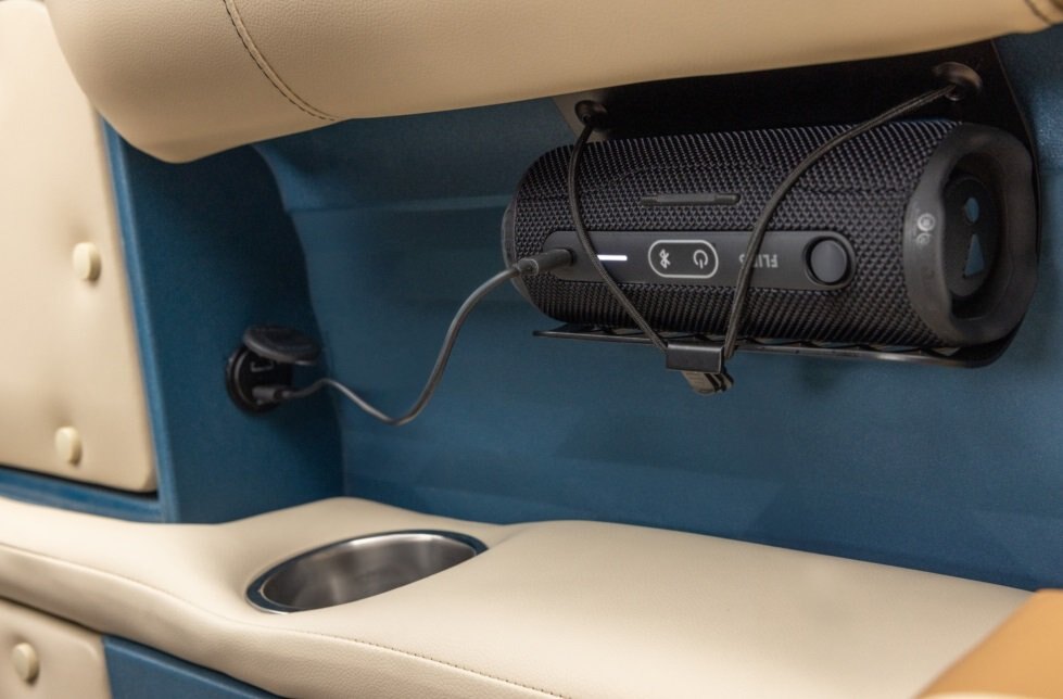 500 furniture series Halo Rotocast console JBL Flip6 WaterProof Speakers Bow USB Charging Port 360 Panoramic Seating Hammock-Like Suspension Seating Aluminum Boarding Ladder Black Bimini with Mooring Cover