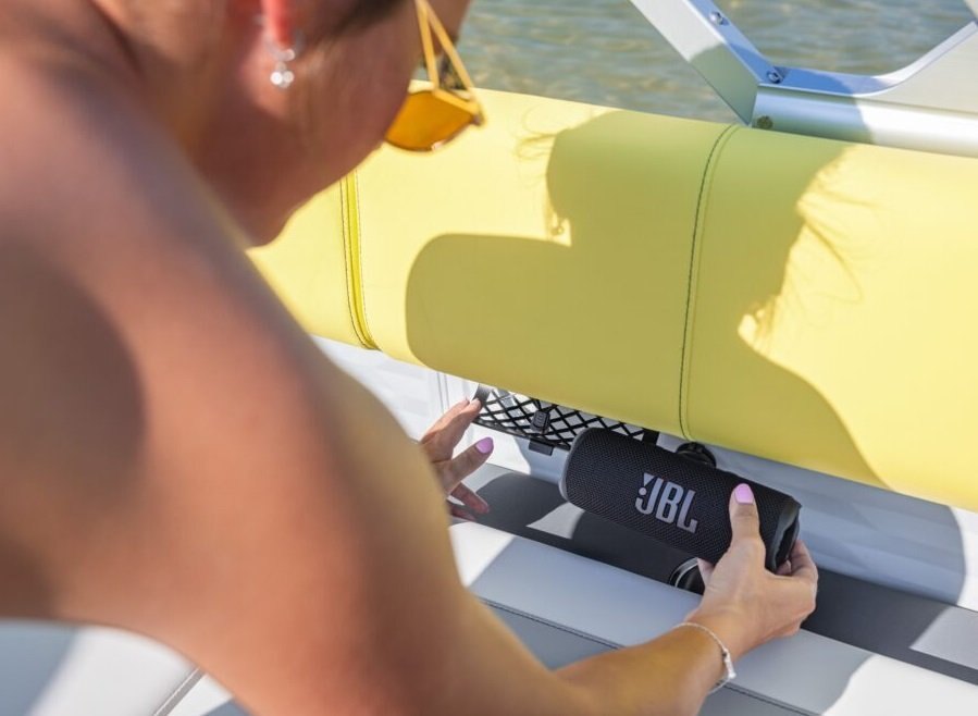 500 furniture series Halo Rotocast console JBL Flip6 WaterProof Speakers Bow USB Charging Port 360 Panoramic Seating Hammock-Like Suspension Seating Aluminum Boarding Ladder Black Bimini with Mooring Cover
